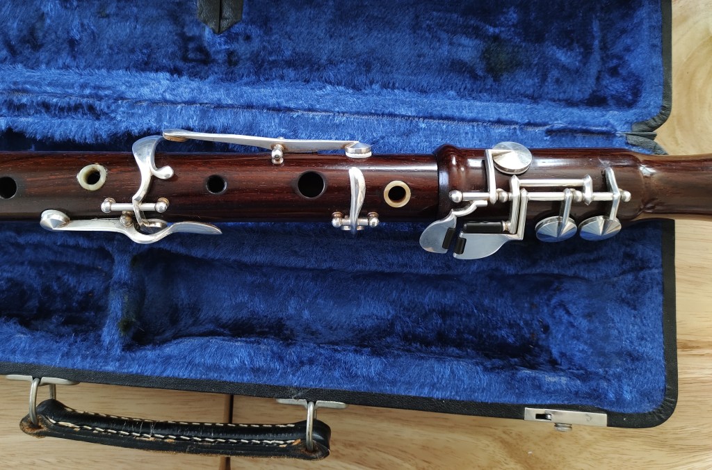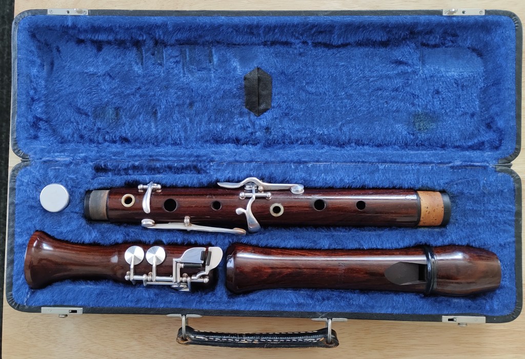 A few weeks went by, and Sally wrote again that it wasn't working out and wanted to know if I wanted to buy it. So I sent an offer, and she accepted. Once it arrived, and I could lay my hands on it, it was even odder than it looked in the photos. And it needed work, which didn't really help Sally's endeavors. The pads were shot, the G# key was cracked, there as a broken spring, etc. So I took it to my repair tech for an overhaul and just got it back. I'm still trying to figure out the fingerings. It's kind of a cross between clarinet, oboe, 6-key piccolo and recorder. The first two octaves play pretty well. I think the third octave will probably play well too, after I figure out the fingerings (that uppermost key must do something).