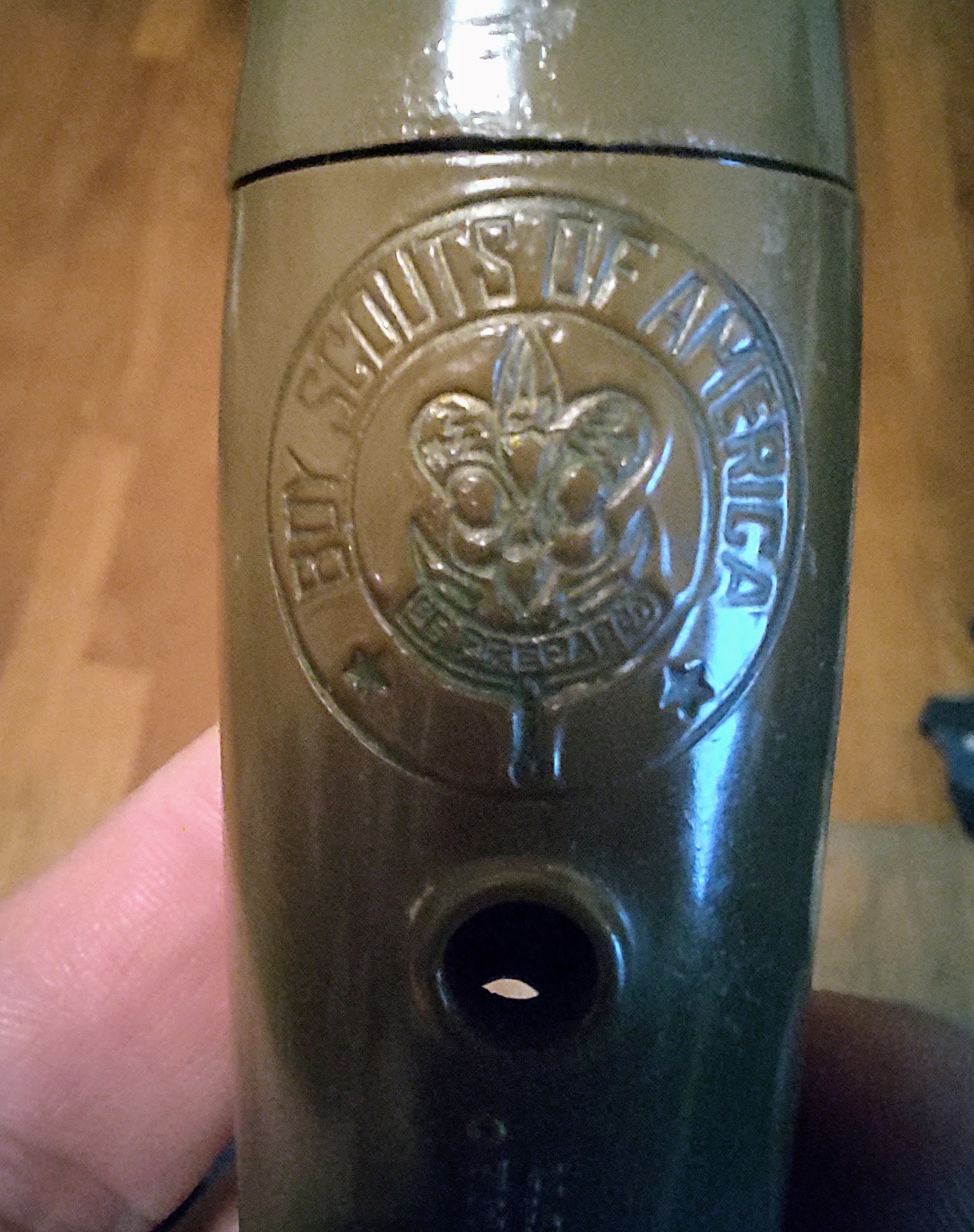 The tonettes made for the military and the Boy Scouts were an olive green color. The Boy Scout instruments have "Boy Scouts of America" embossed on the back.