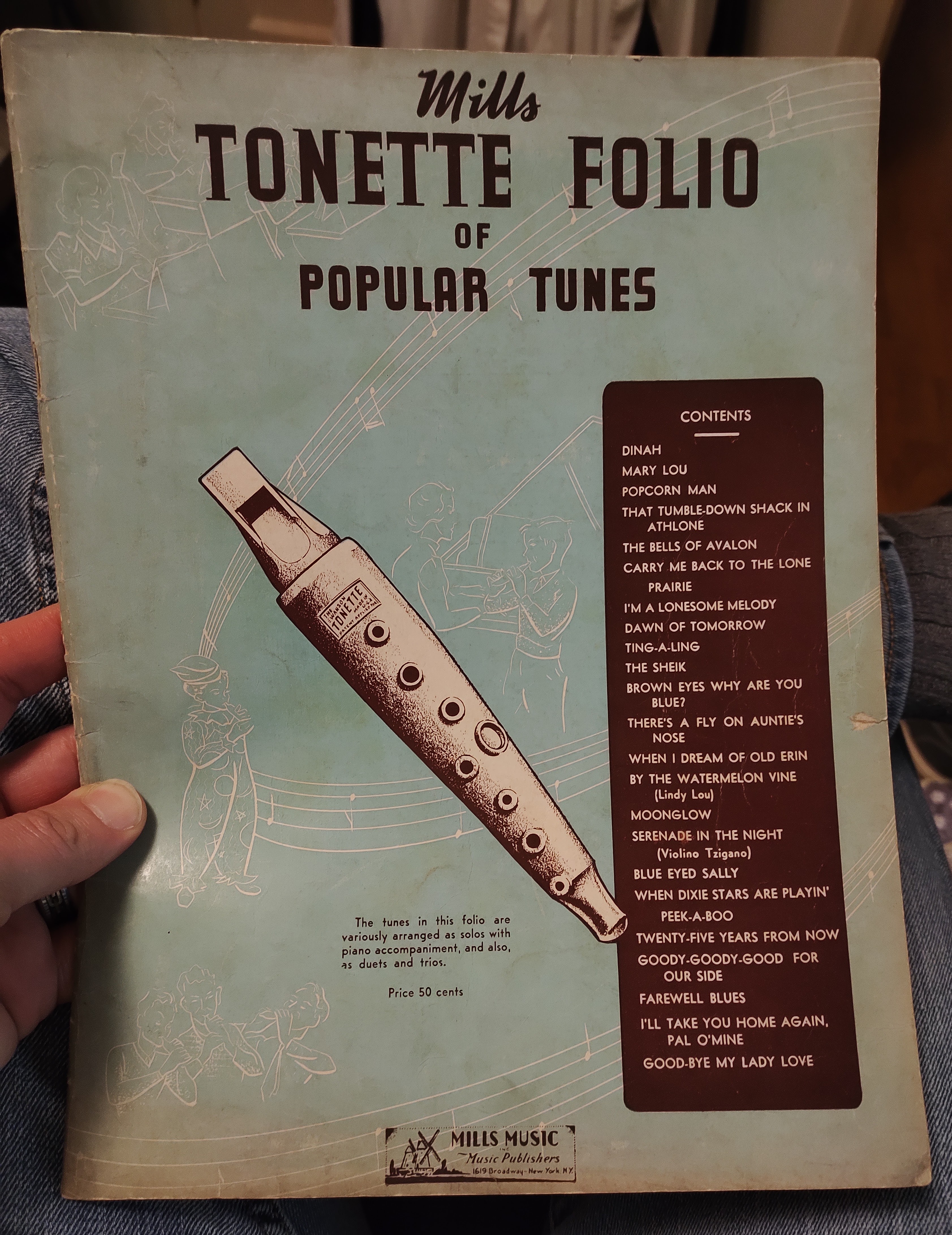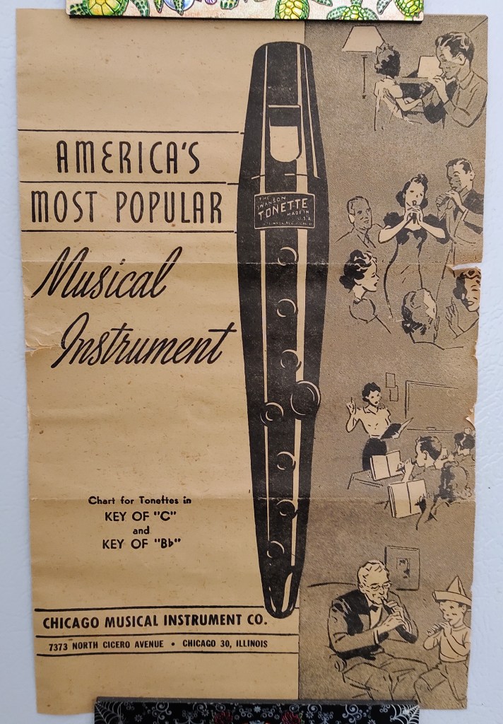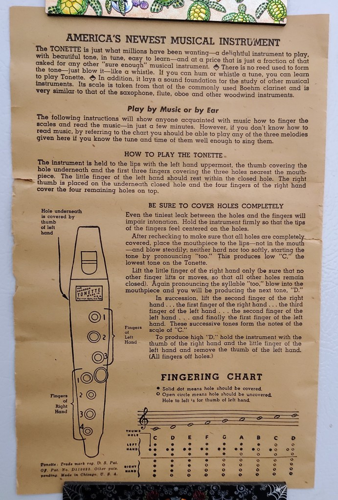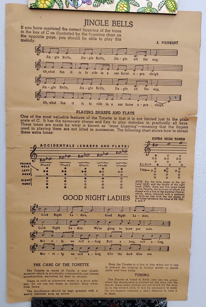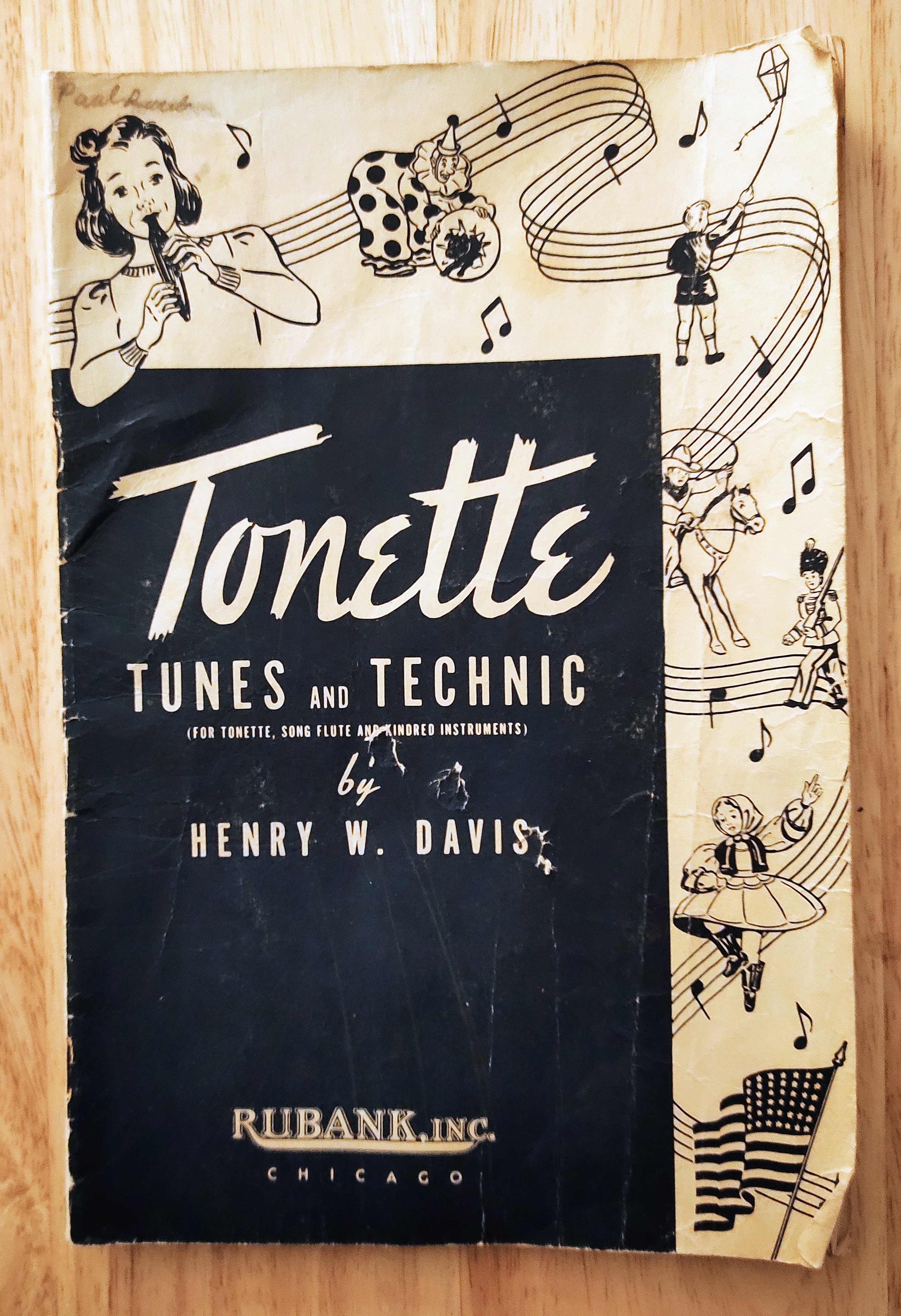 There was even a newsletter you could subscribe to called "Tonette News and Tune of the Month". I'm not sure of the dates of these. I've got the first 5 editions, but they aren't dated. There is a copyright of 1939, but that may just refer to the tunes on the inside. The have short articles about musicianship, how to care for your instrument, information about other instruments and a song. The tunes in the ones I have are written for 2 tonettes (second tonette is optional) and piano.