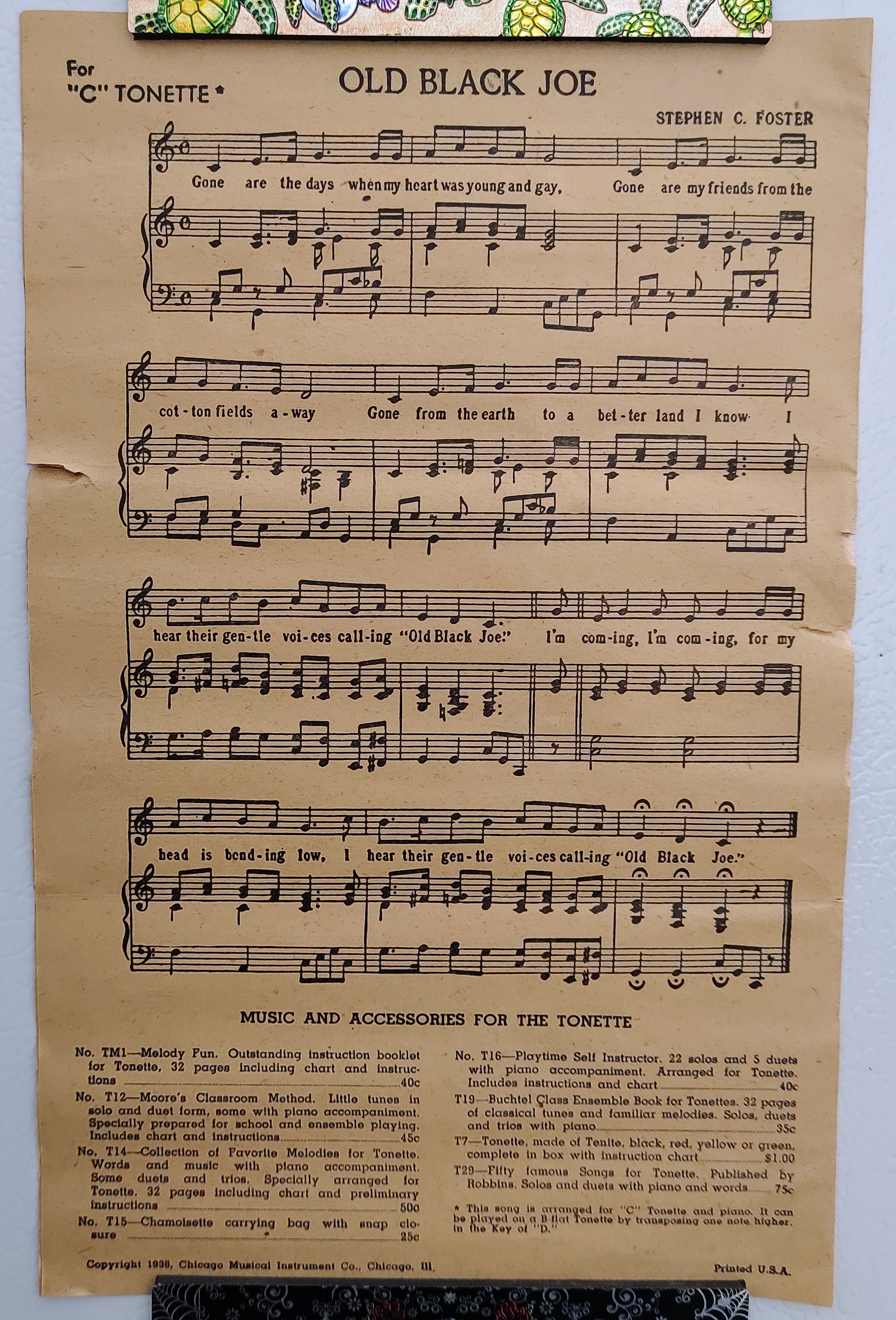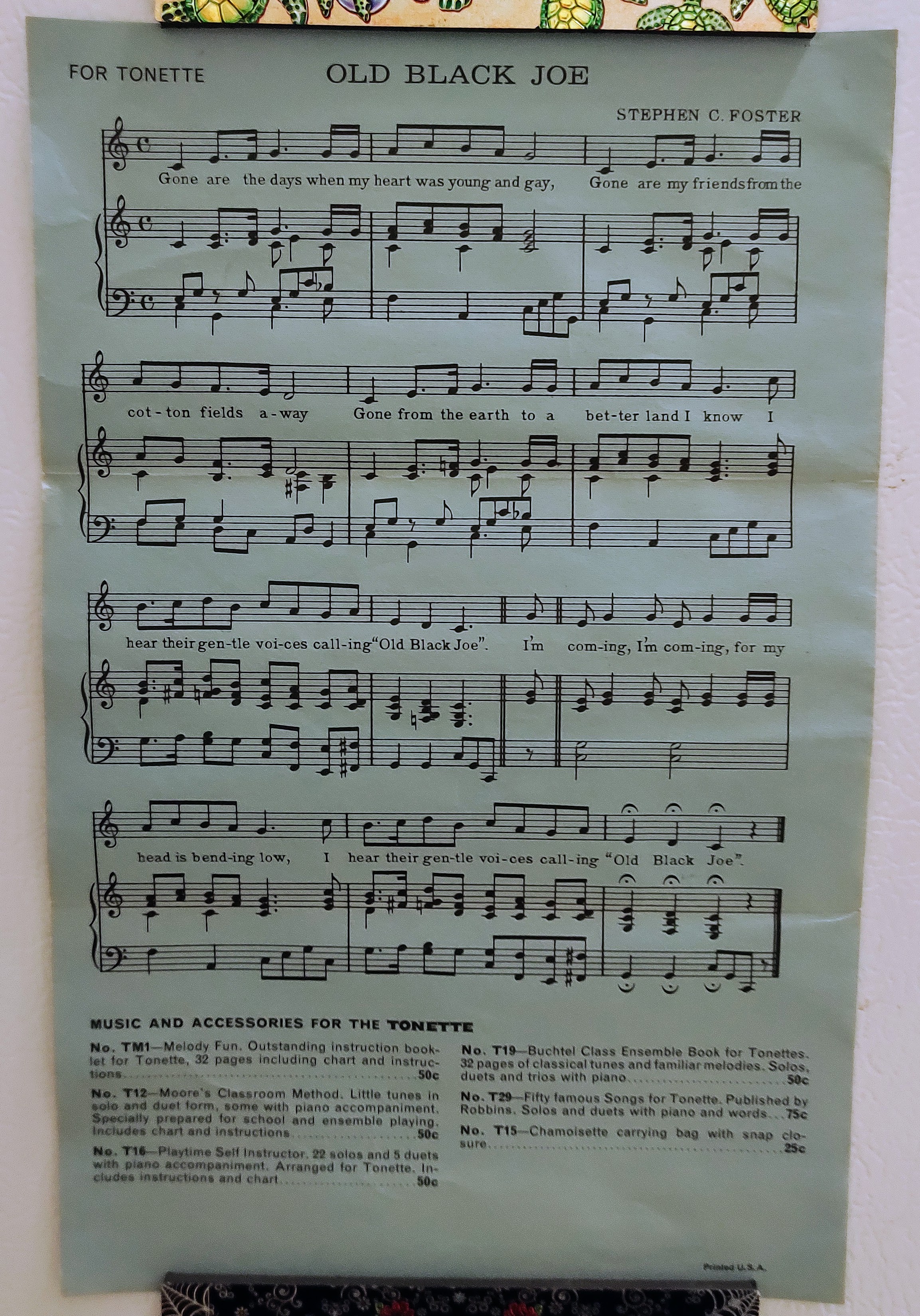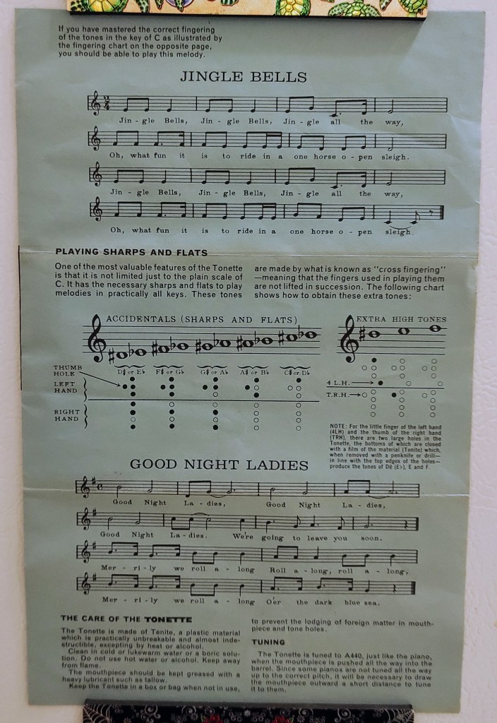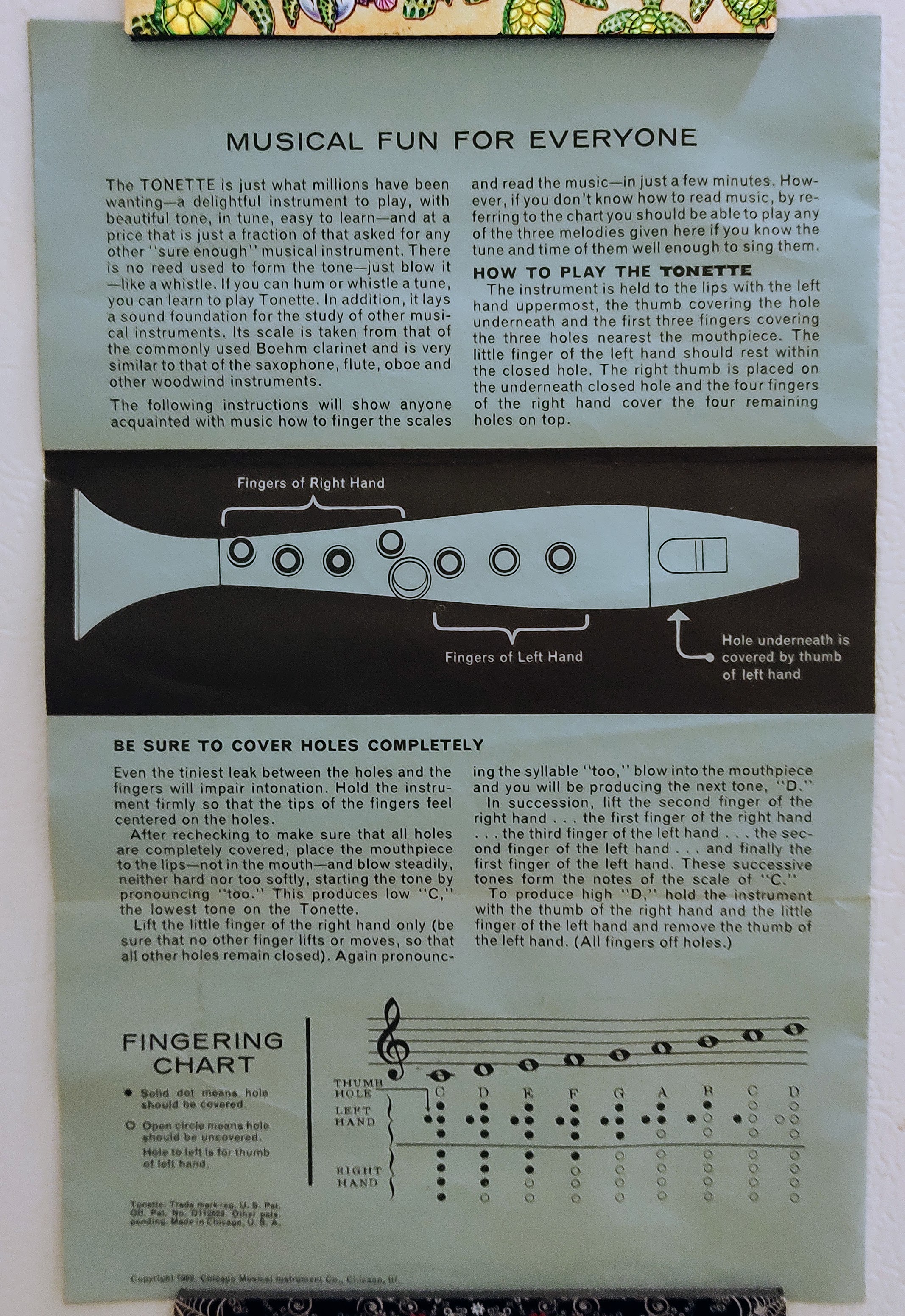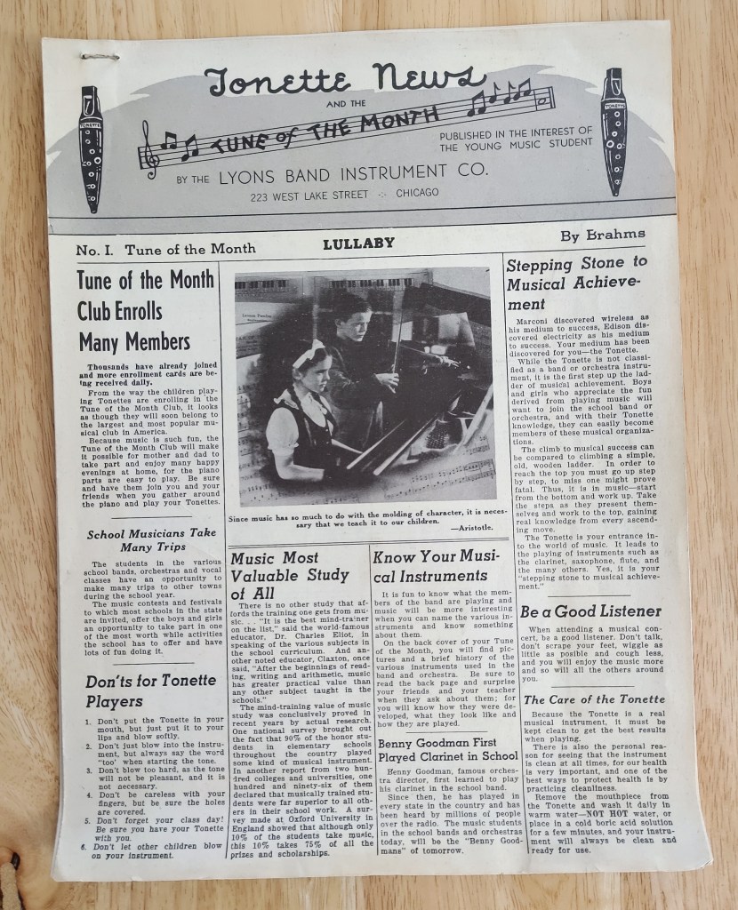 There was even a newsletter you could subscribe to called "Tonette News and Tune of the Month". I'm not sure of the dates of these. I've got the first 5 editions, but they aren't dated. There is a copyright of 1939, but that may just refer to the tunes on the inside. The have short articles about musicianship, how to care for your instrument, information about other instruments and a song. The tunes in the ones I have are written for 2 tonettes (second tonette is optional) and piano.