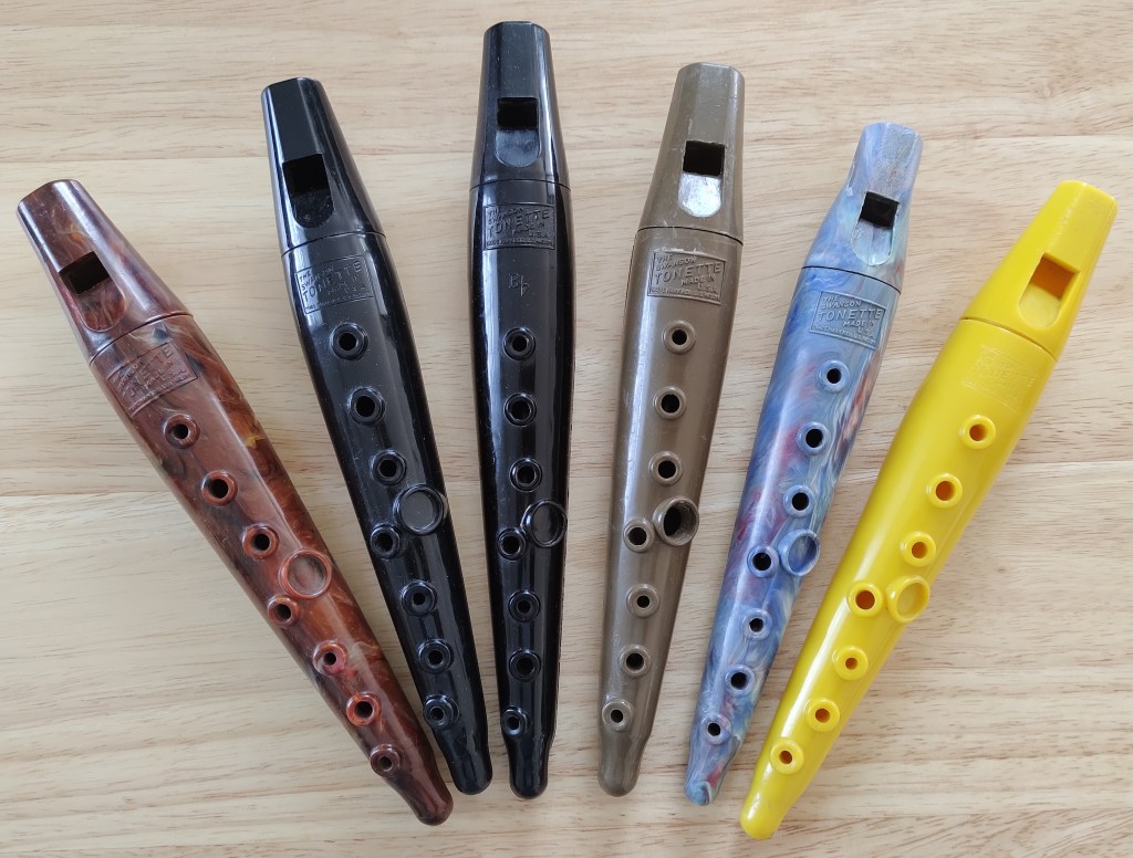 The tonette is basically a plastic, inline (vertical) ocarina. Initially, they have 7 holes on top and a thumb hole on the back. There are two additional indentations for a finger and the right thumb that can be removed with a sharp knife to extend the range if so desired. They came out in 1938 and became a popular starting instrument in the school systems. Most of them were black, but they also came in various colors through the years. There were bright colors like red, green and yellow. There were some swirled "marble-y" colors. And there were olive green ones made for the military during WWII and later used for the Boy Scouts. Tonettes are no longer made. There was a reissue by Gibson a few years ago, but they weren't of the same quality.