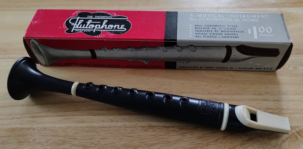 Another popular pre-band instrument used in school systems was the Flutephone by Trophy. Again, similar looking to the Tonette (and Song Flute) but with an open end like a recorder. I would categorize this as an actual flute. When the end is closed, there is no sound. Unlike the Tonette and Song Flute, black was the scarcer color. The primary color scheme for the Flutophone was white with red accents. Flutophones are still being produced, but again, the quality is not very good.