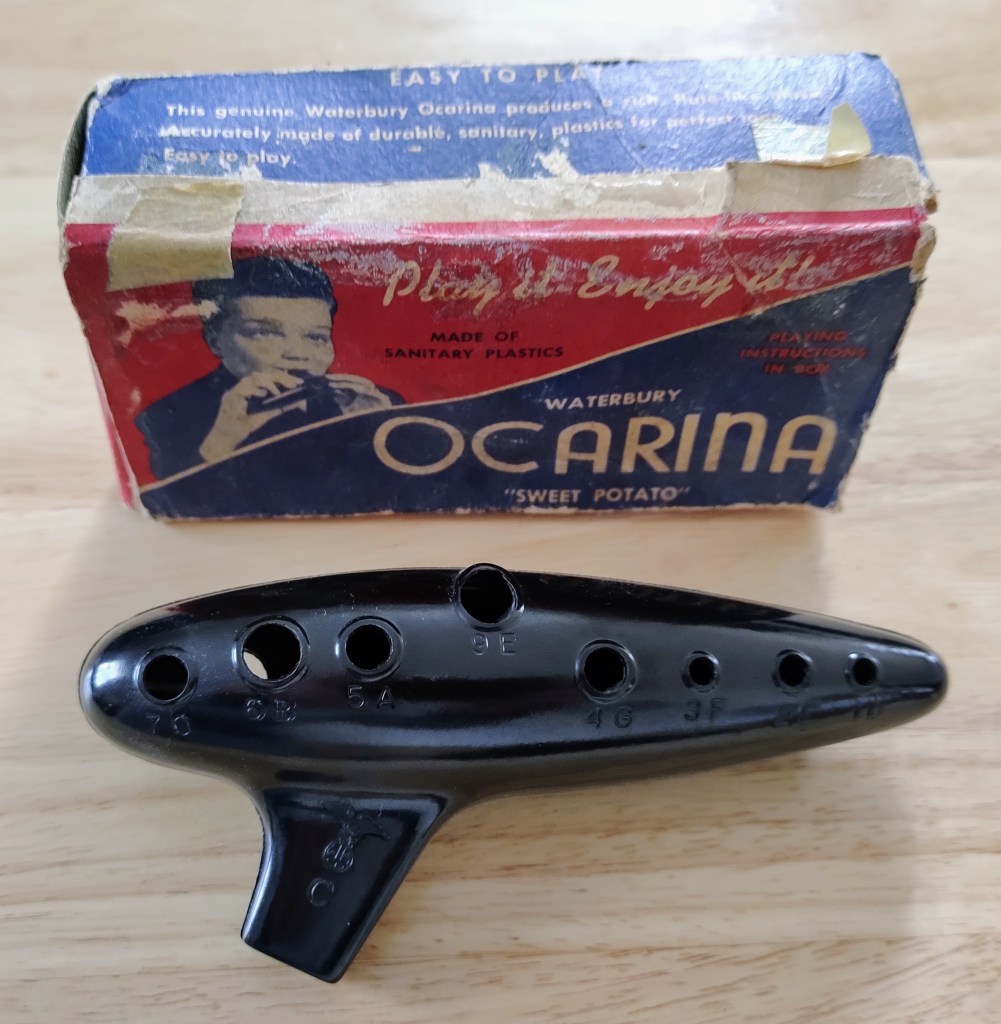 I'm including a ocarina by Waterbury because it's the same vintage and would have been marketed to the same person. It's a heavy plastic ocarina of varying quality. They came in two styles, and you could choose the key of C or the ever popular key of E.