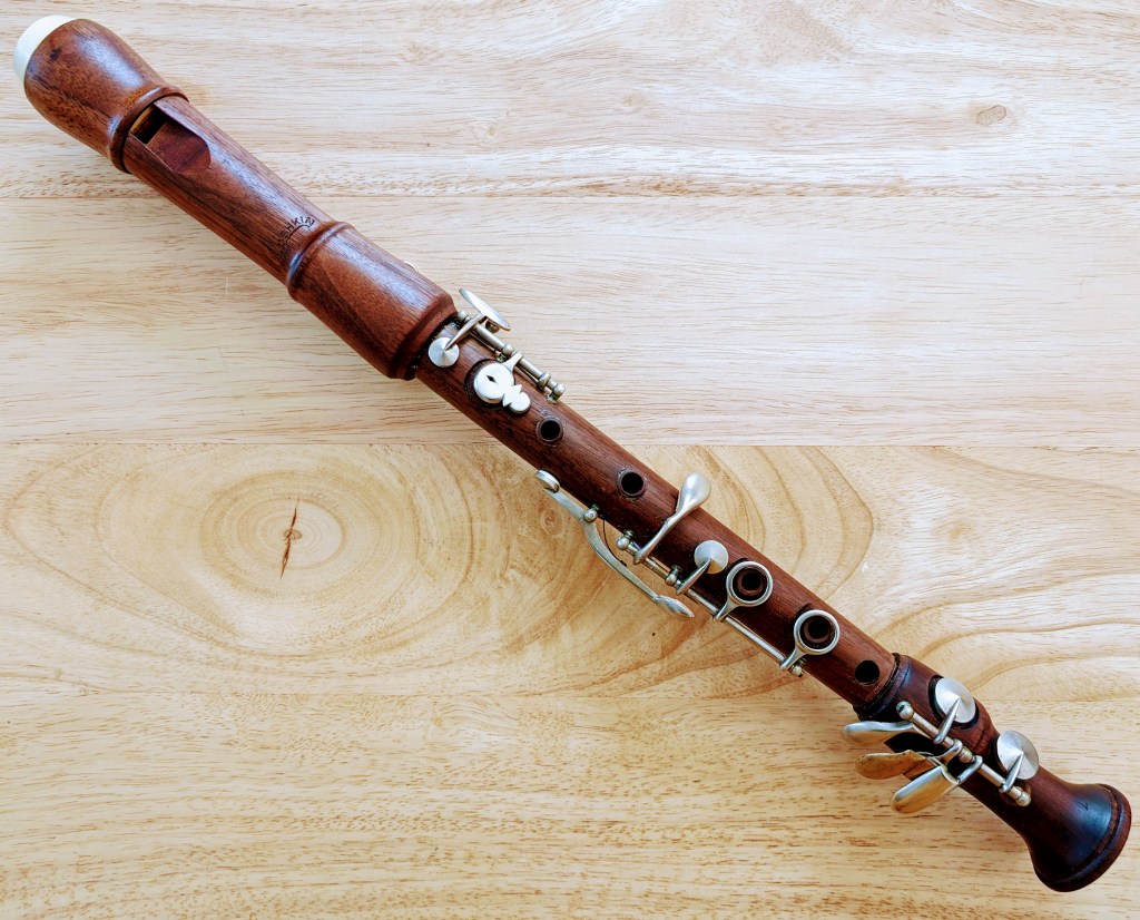 A few months ago, an unusual tenor recorder showed up on the big auction site. It was keyed (almost) like an eight-key flute. Other than "Made in Germany", there were apparently no other indications of a maker. The headjoint was clearly cracked in the photos. But it was unusual enough that I decided to place a bid, and surprisingly I won the auction. There was some competition, but I think the cracked head scared most people away. It was obviously a high-end recorder from back in the day....rosewood, keys, adjustable thumbrest, nice case.