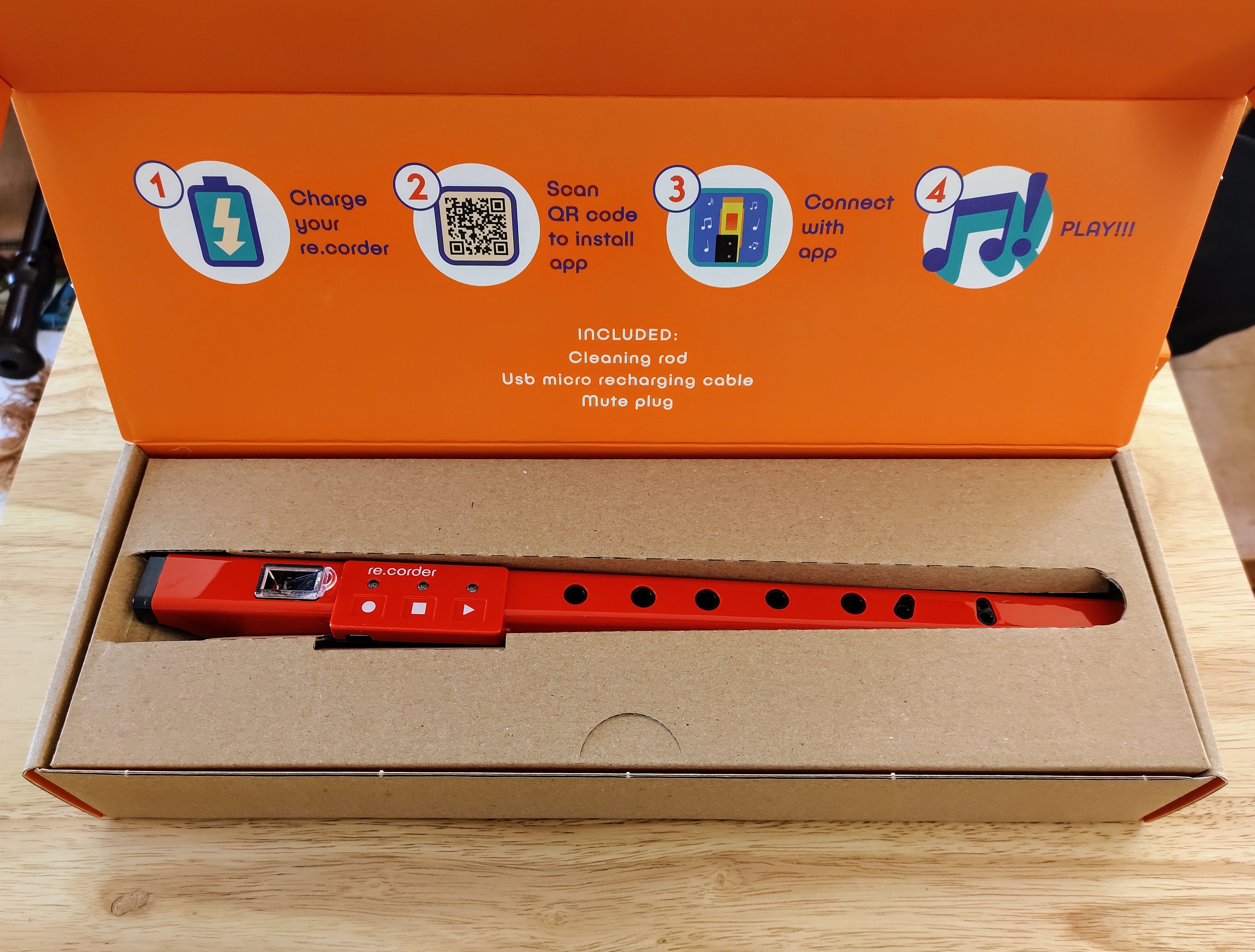 I'm pleased with the purchase so far. It gets better every time I pick it up. Plus, there are lots of settings that need to be explored. I need to write down the default settings before I get into changing things though. Included with the re.corder is a USB charging cable, an extra plug (which covers the fipple when you are connected to the app), a "quickstart" guide, and a cleaning rod. Comes in red, blue, white, and black.