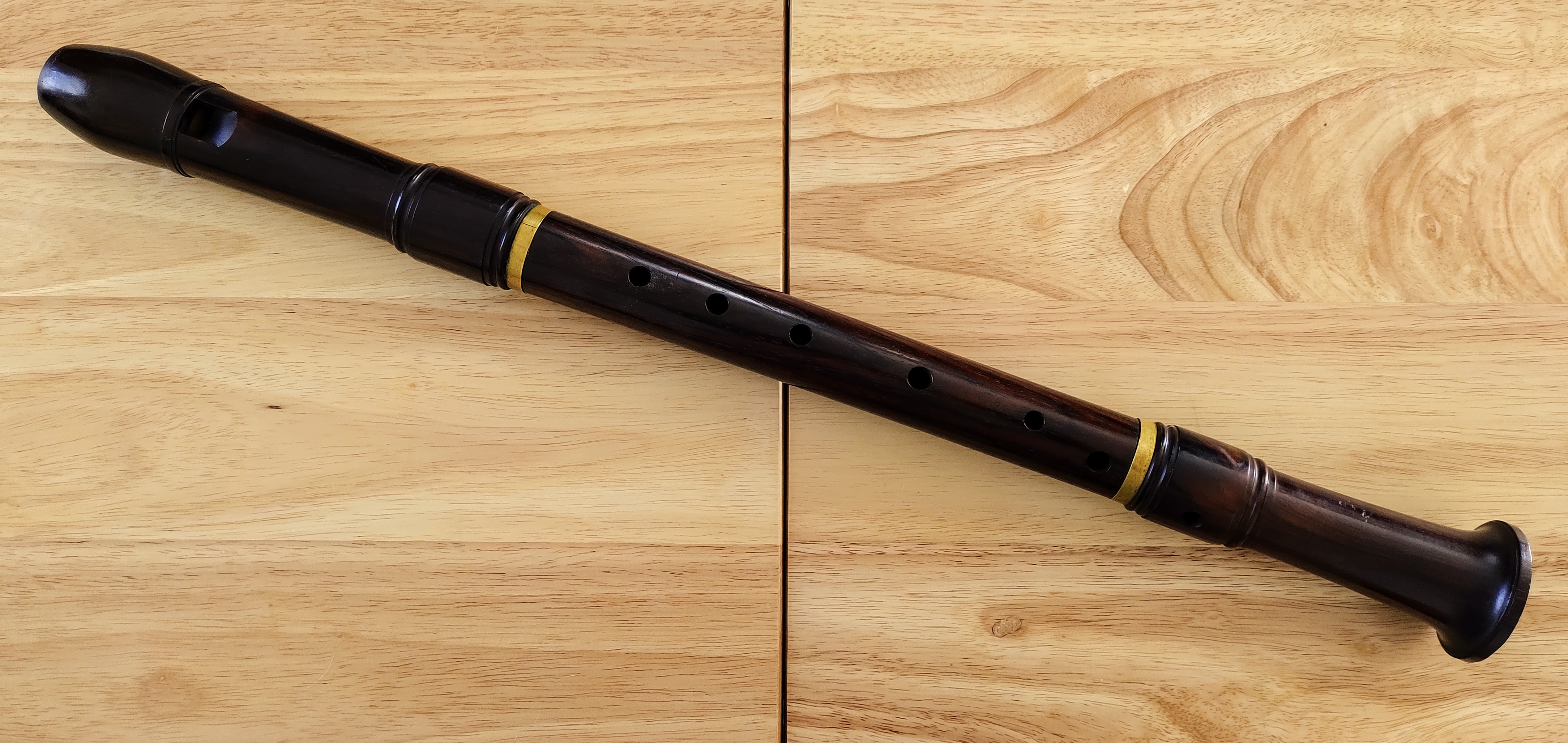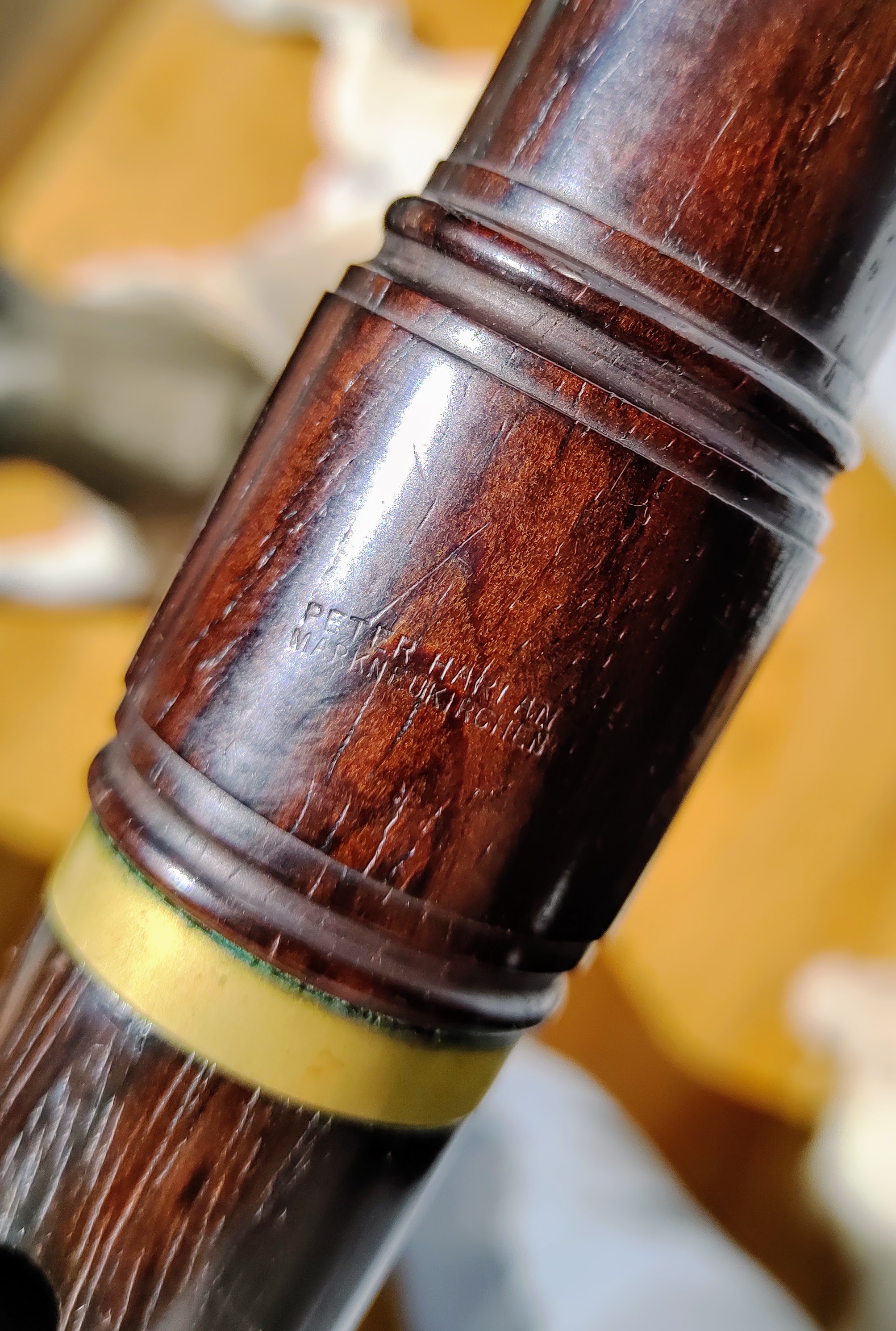 It is branded "Peter Harlan Markneukirchen". Peter Harlan is credited with developing the German system recorder. He wasn't really a wind instrument maker (I think I read he did make some, though), and hired various other instrument makers in Markneukirchen, Germany to make his recorders. Most of these were made by Martin Kehr. This one is made from beautifully striped rosewood and is the German fingering system typical of Peter Harlan instruments.