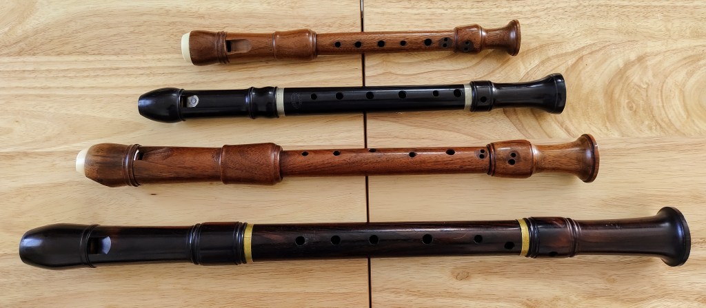 Most people think of recorders as coming in a couple of sizes. Soprano and alto are the most common. As with other woodwind instruments, there is a whole family of recorders. Typically they alternate between the keys of C and F (sopranino in F, soprano in C, alto in F, etc). Recorders also come in more obscure keys.....sopranos in Bb and A, altos in G, tenors in D. I've recently picked up a tenor in D (AKA voice flute).